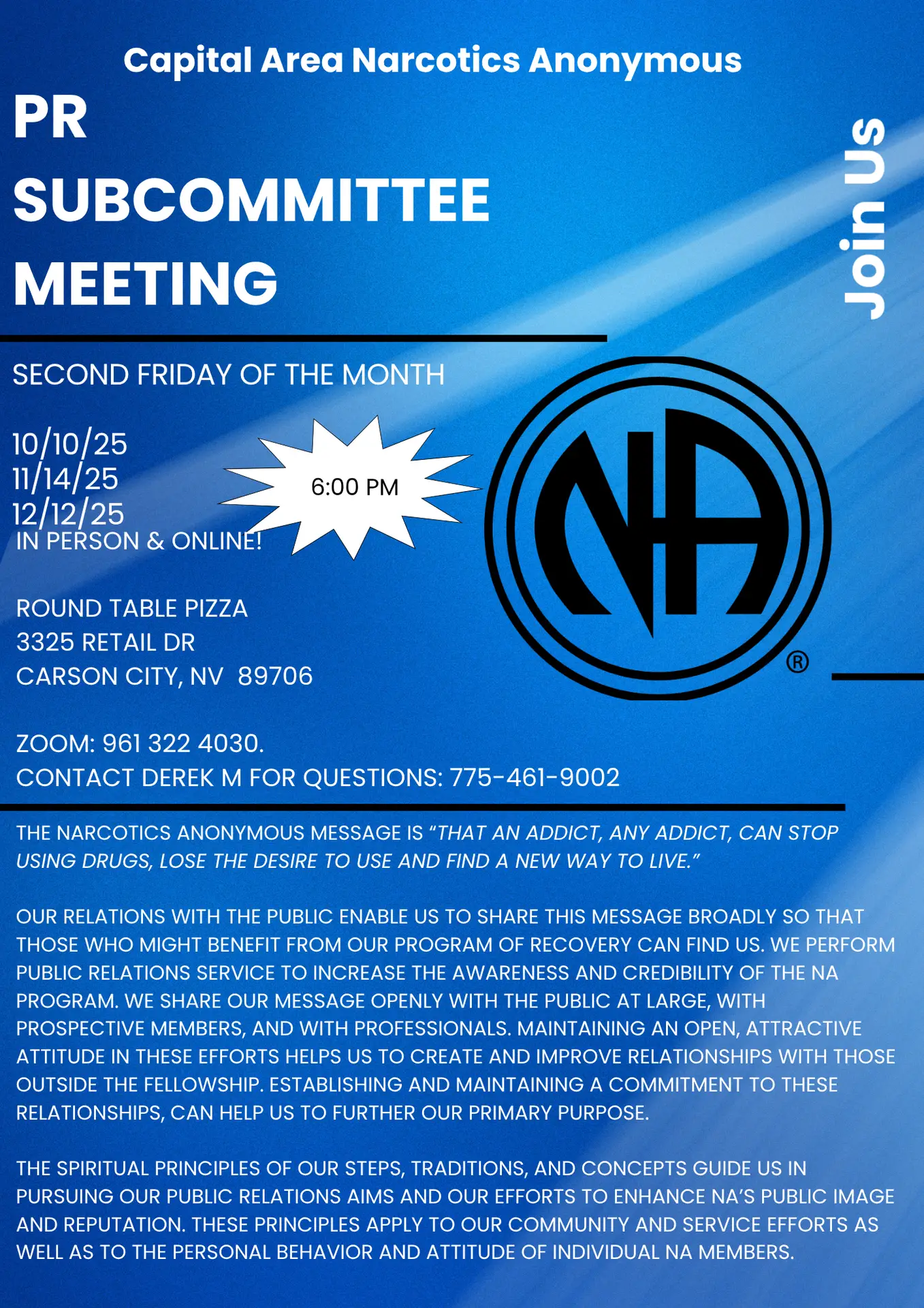 Capital Area of Narcotics Anonymous; monthly public relations subcommittee meeting |